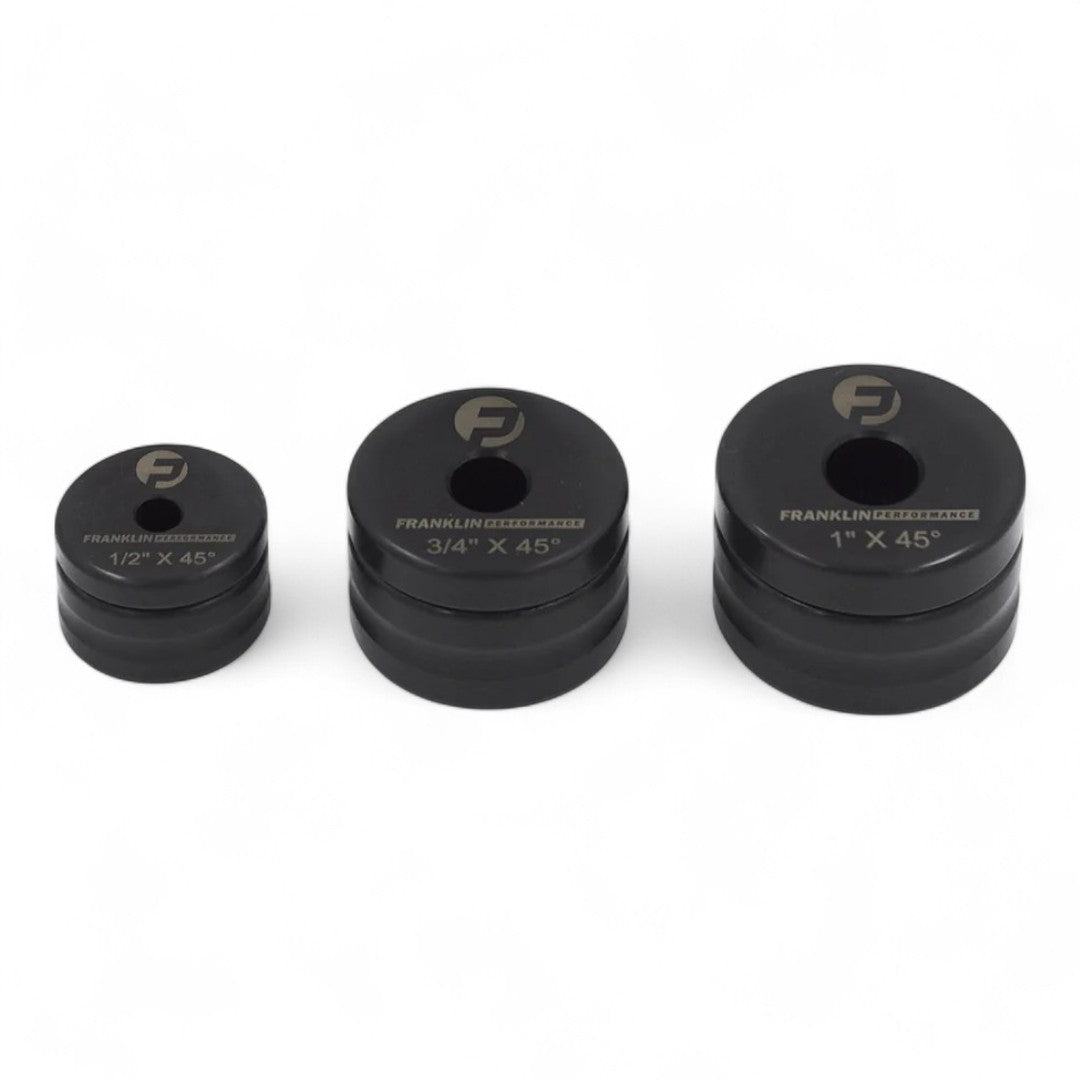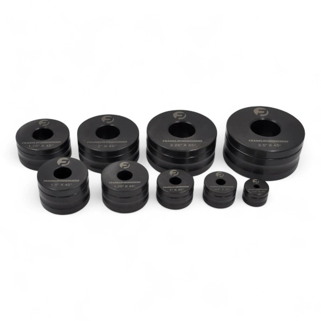 The dies work great in a press or ironworker, and the smaller sizes can also be used with a nut & bolt on lighter steel or aluminium.