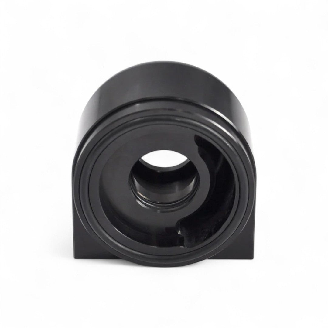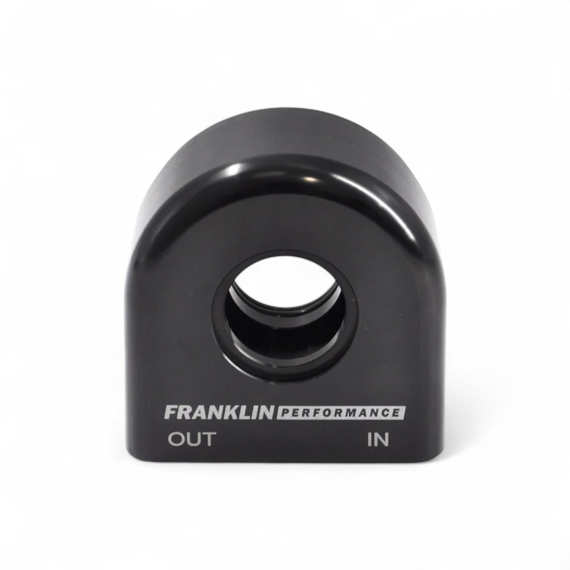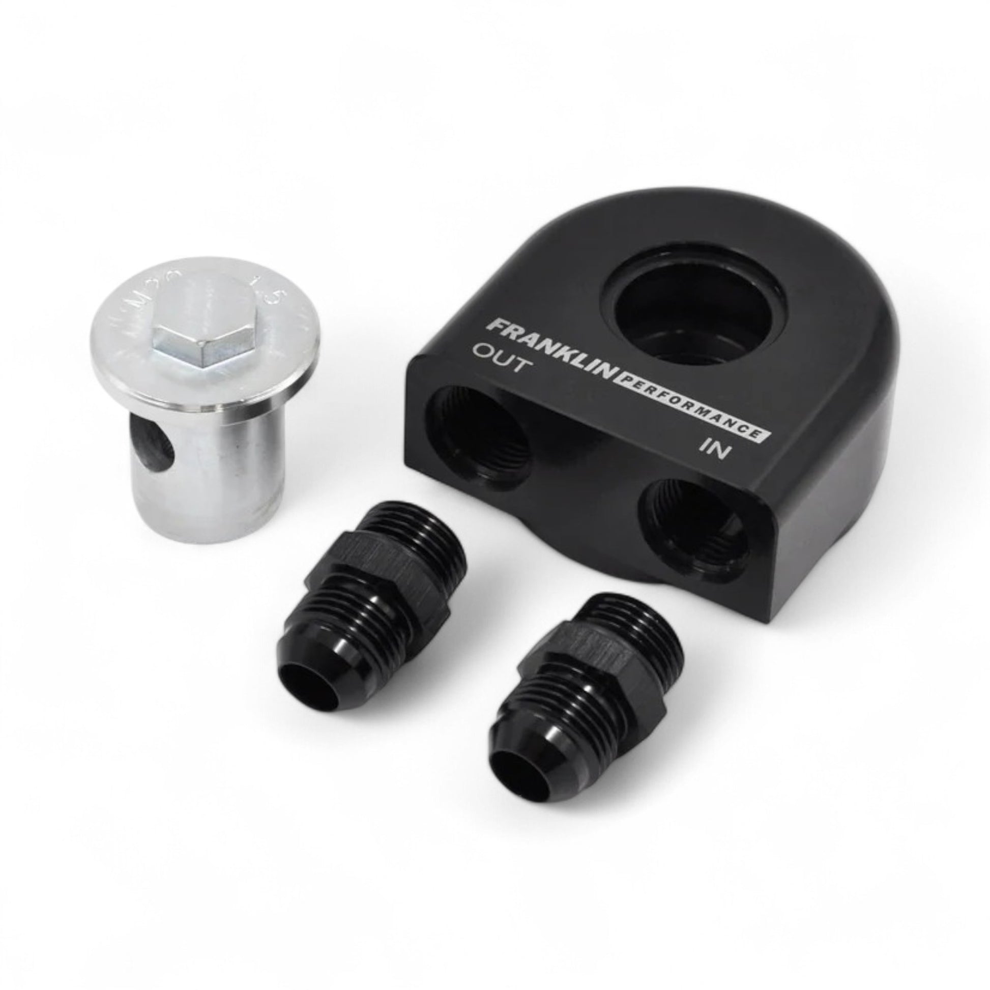 Low profile remote oil filter block fitting manufactured by Franklin Performance for plumbing a remote oil filter, making filter changes easier or where space is limited in the engine bay