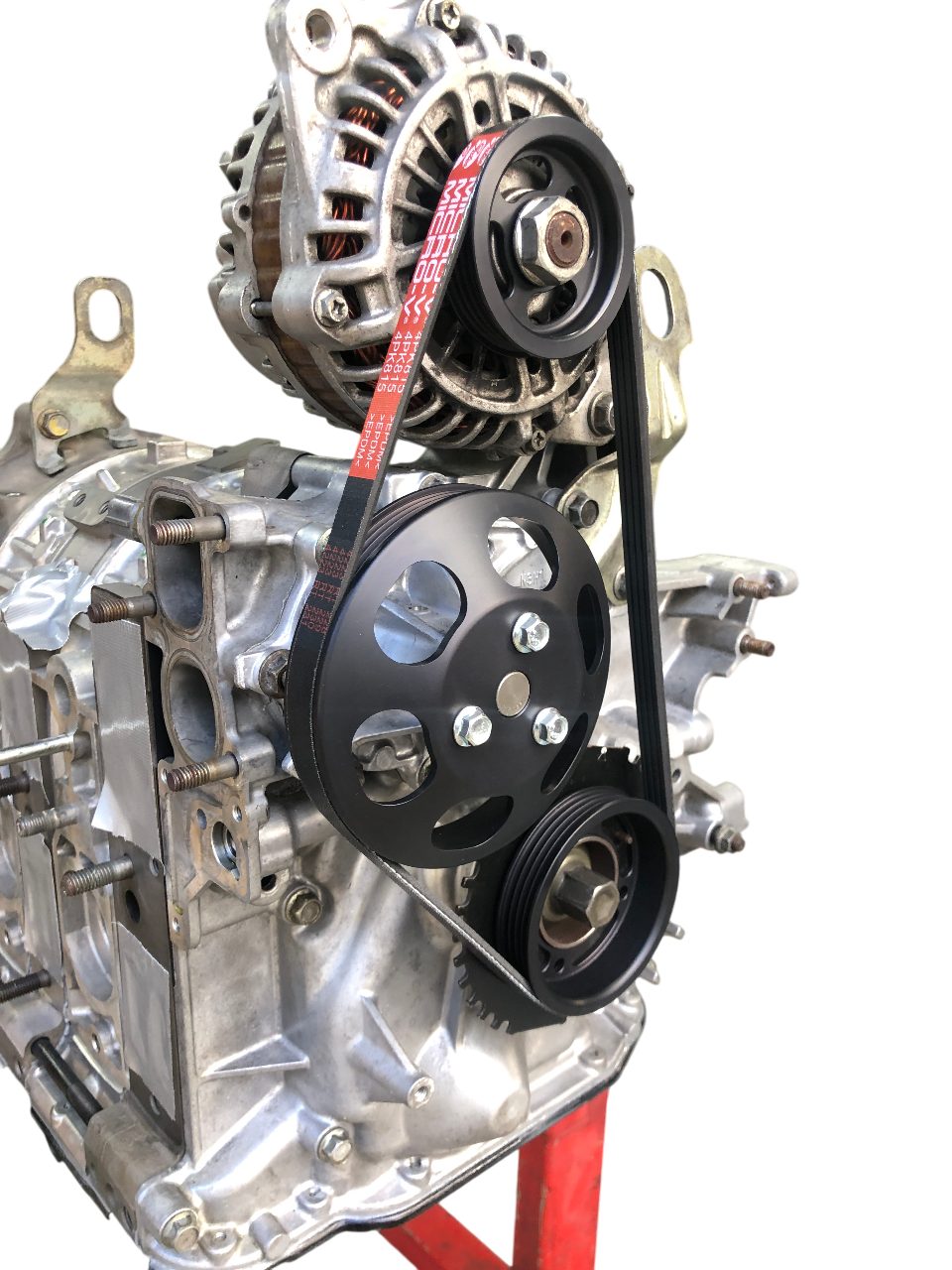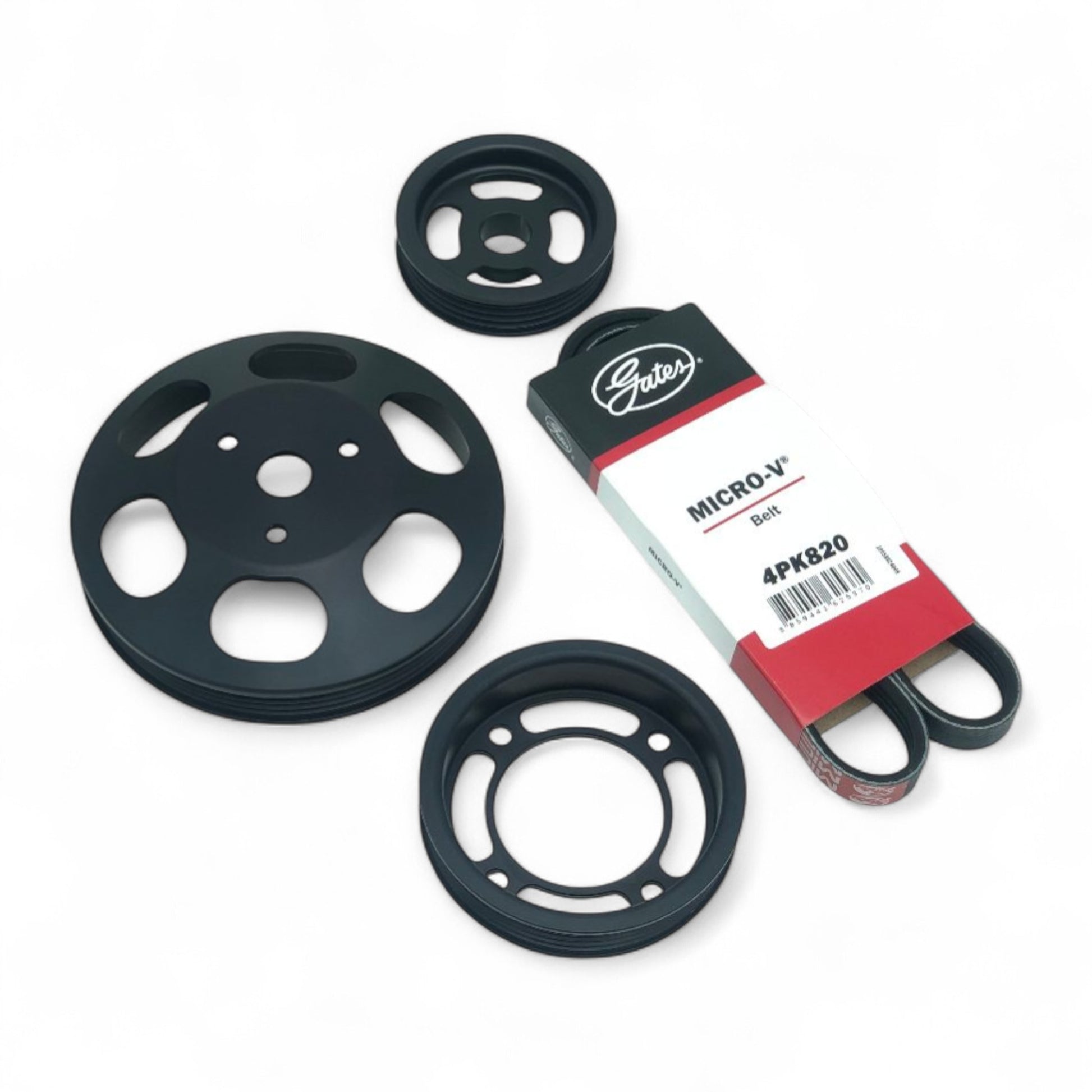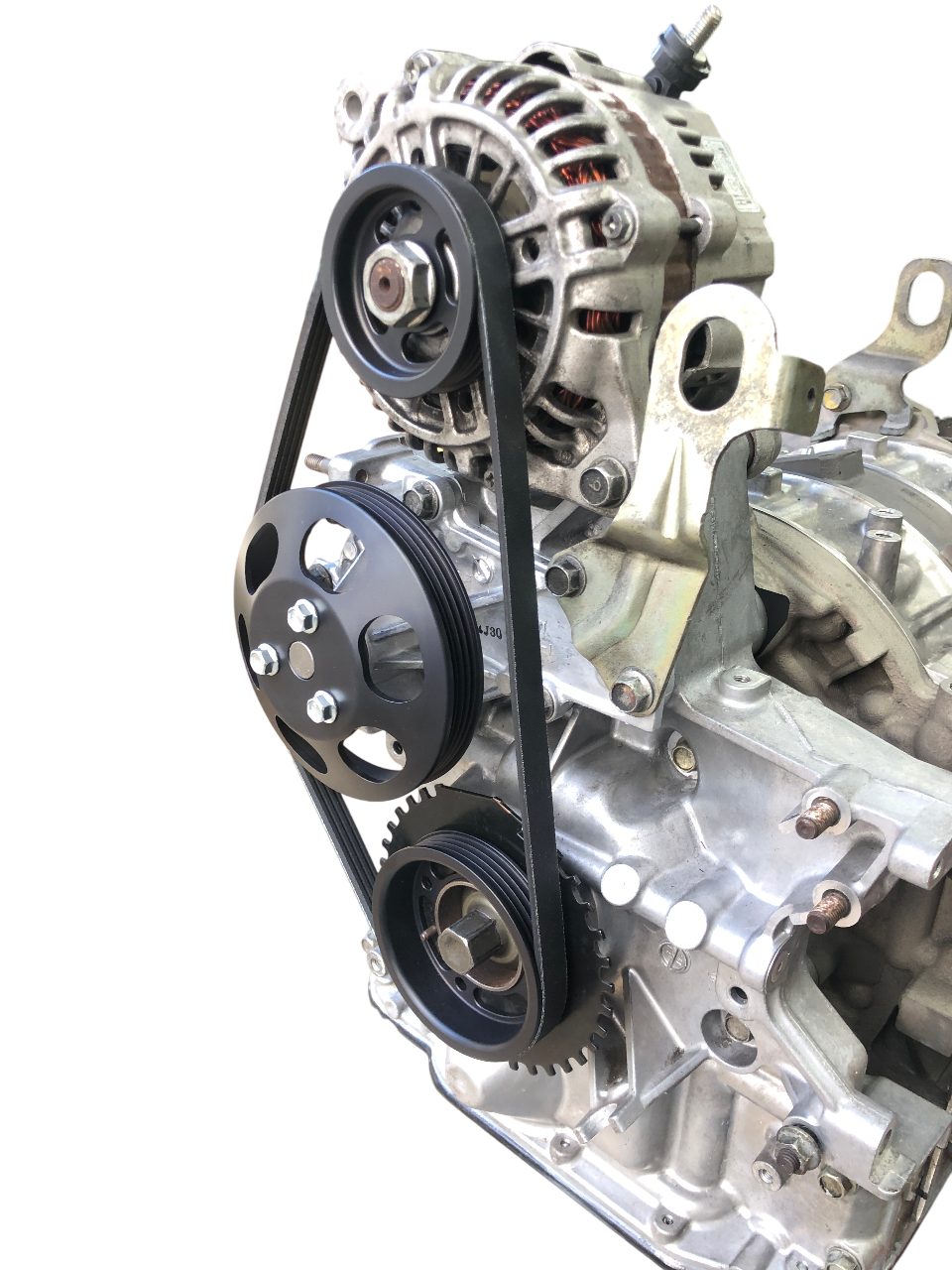 Green Brothers have designed this kit to have the least amount of horsepower loss possible. Diameters and resulting pulley speeds are optimised for waterpump and alternator efficiency. Slowing down the waterpump significantly reduces impeller cavitation and parasitic drag. The narrower than stock4PK belt has less weight & frictional loss than the factory width belt. The net result is lower coolant temps, less power loss, and improved engine acceleration response
