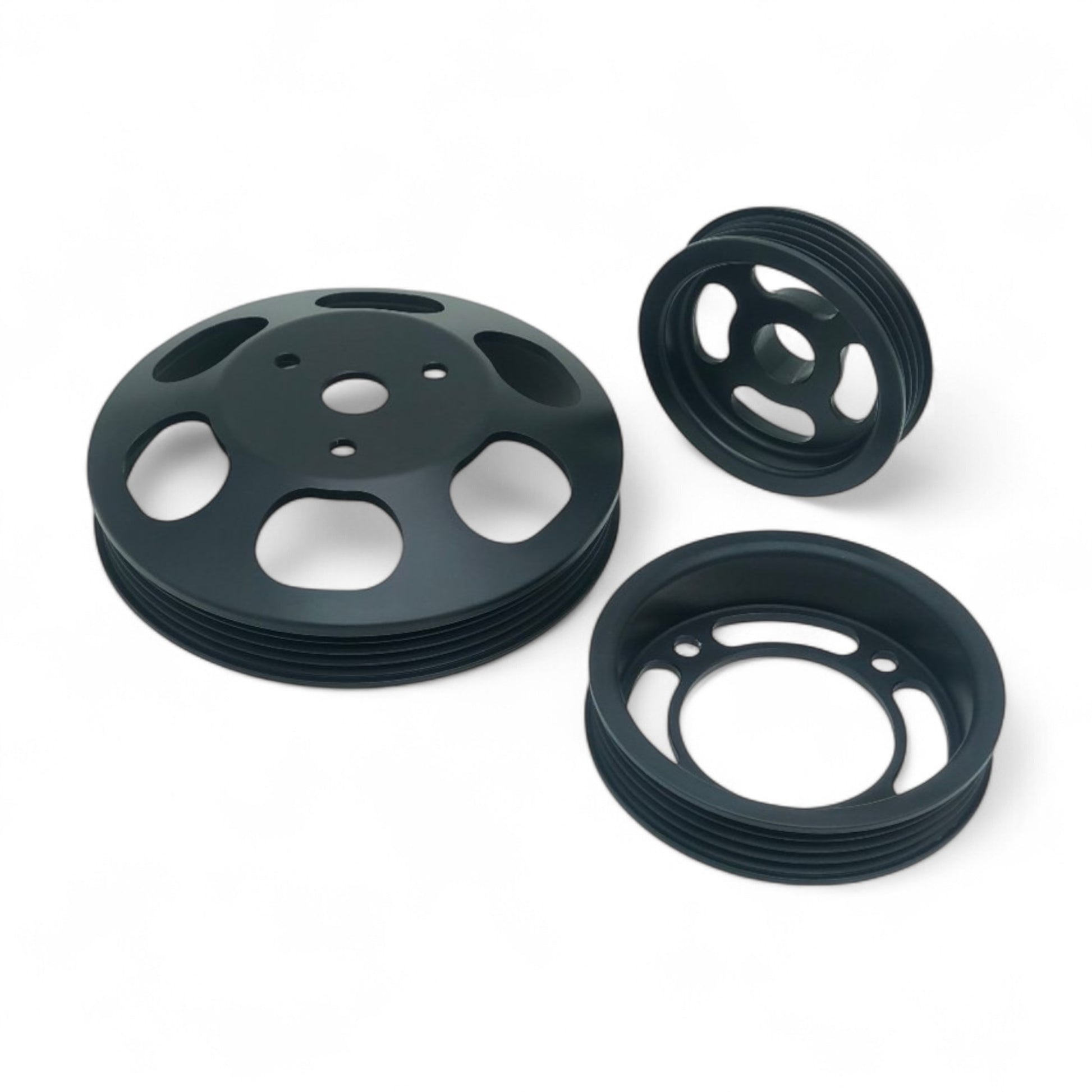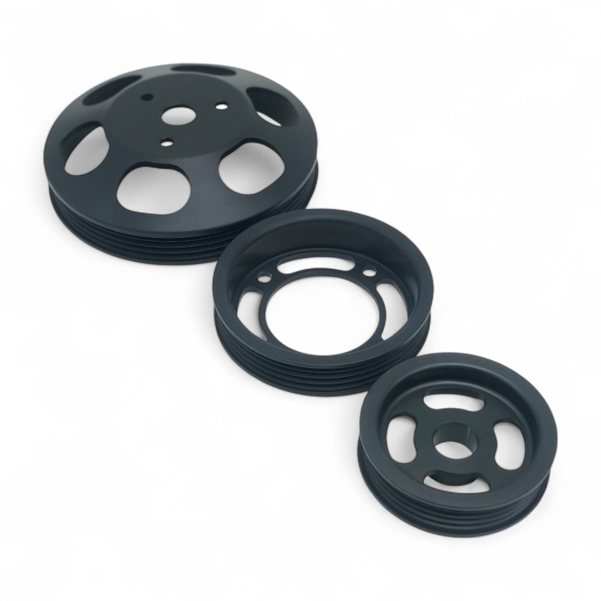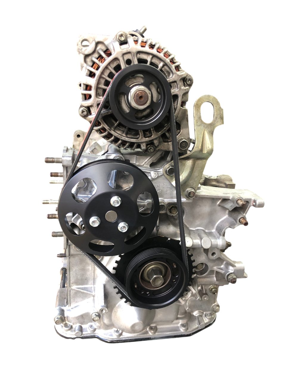 Green Brothers have designed this kit to have the least amount of horsepower loss possible. Diameters and resulting pulley speeds are optimised for waterpump and alternator efficiency. Slowing down the waterpump significantly reduces impeller cavitation and parasitic drag. The narrower than stock4PK belt has less weight & frictional loss than the factory width belt. The net result is lower coolant temps, less power loss, and improved engine acceleration response