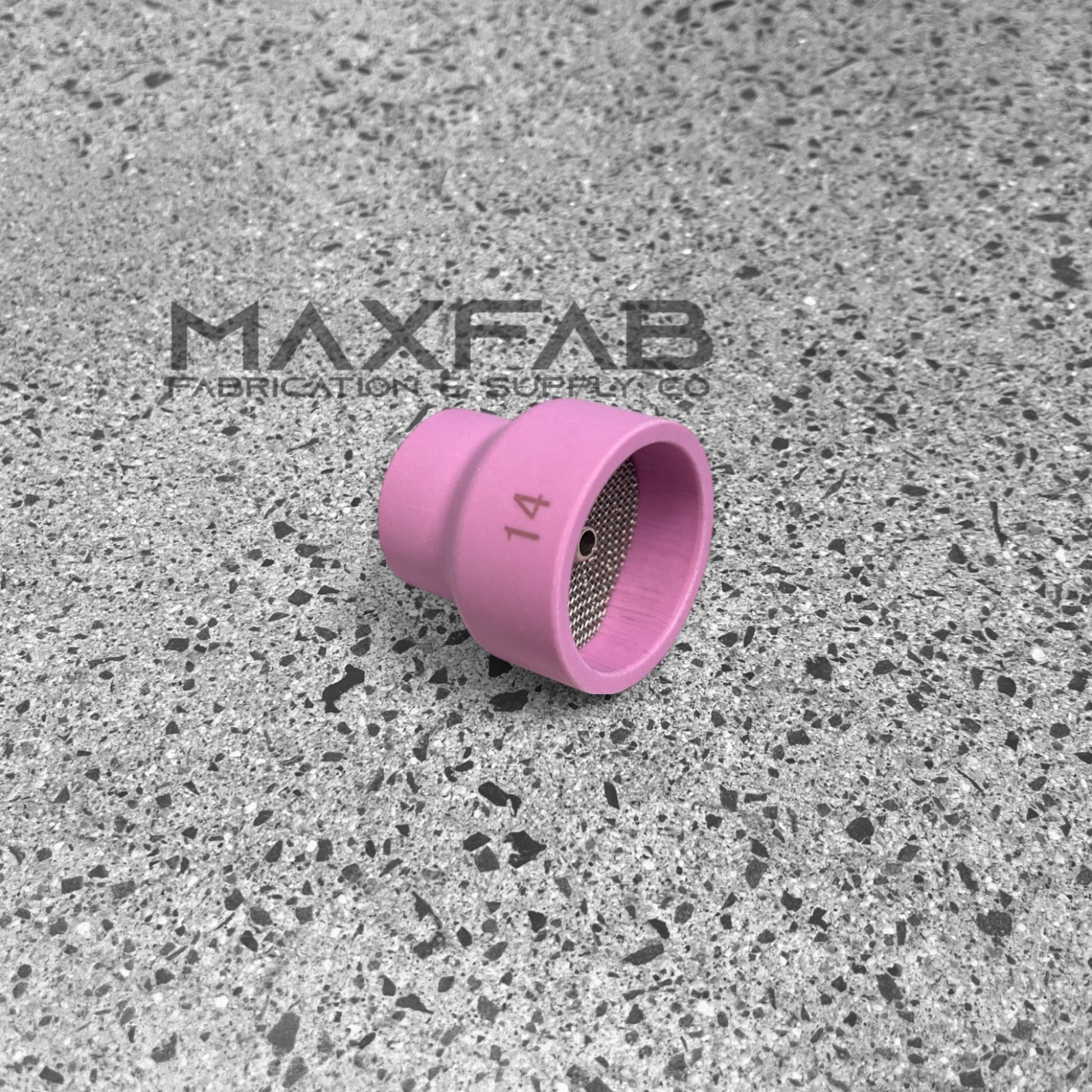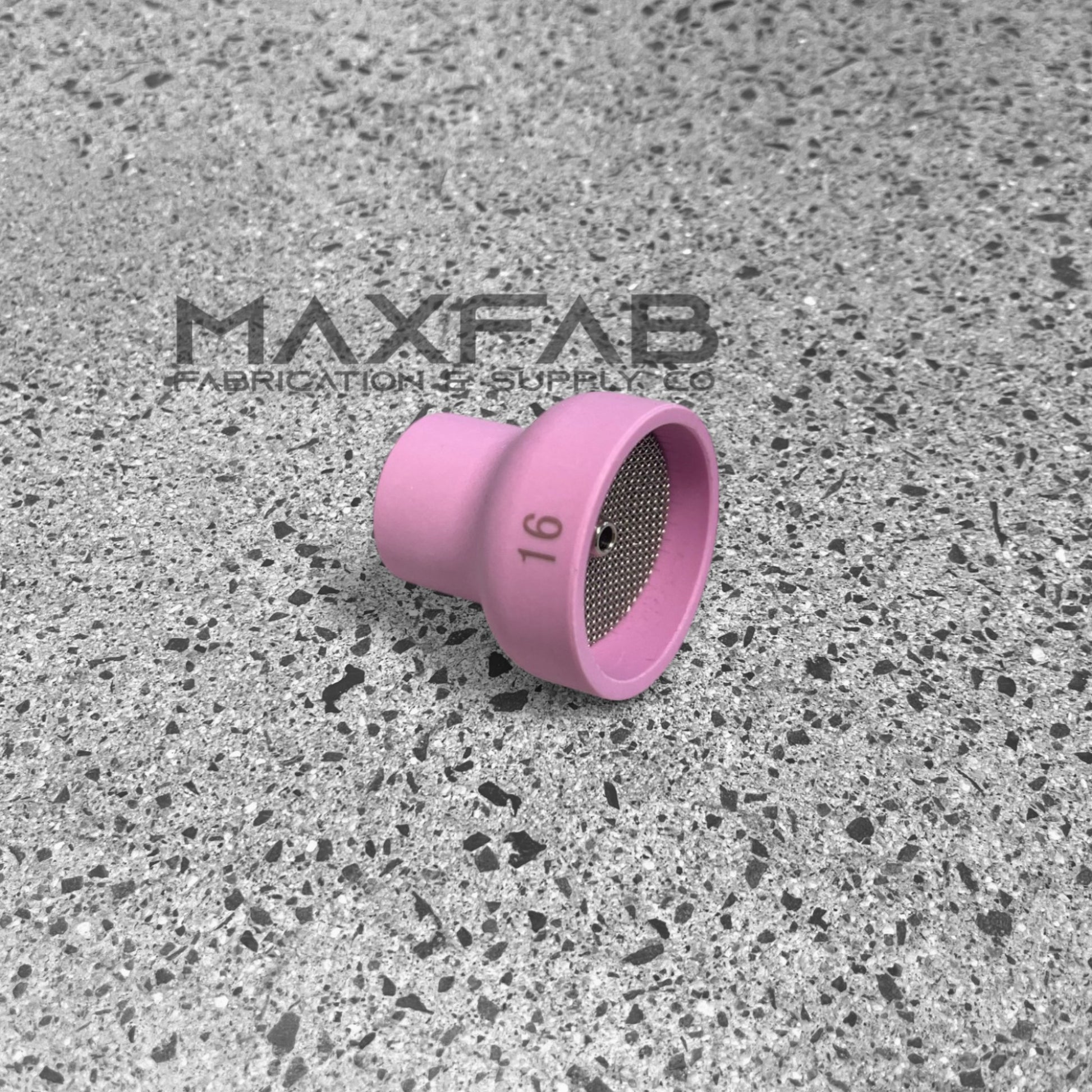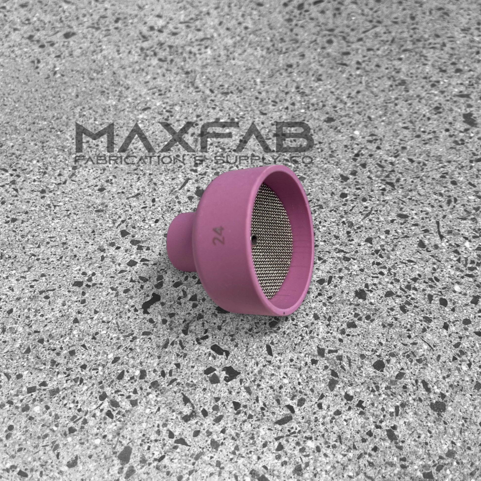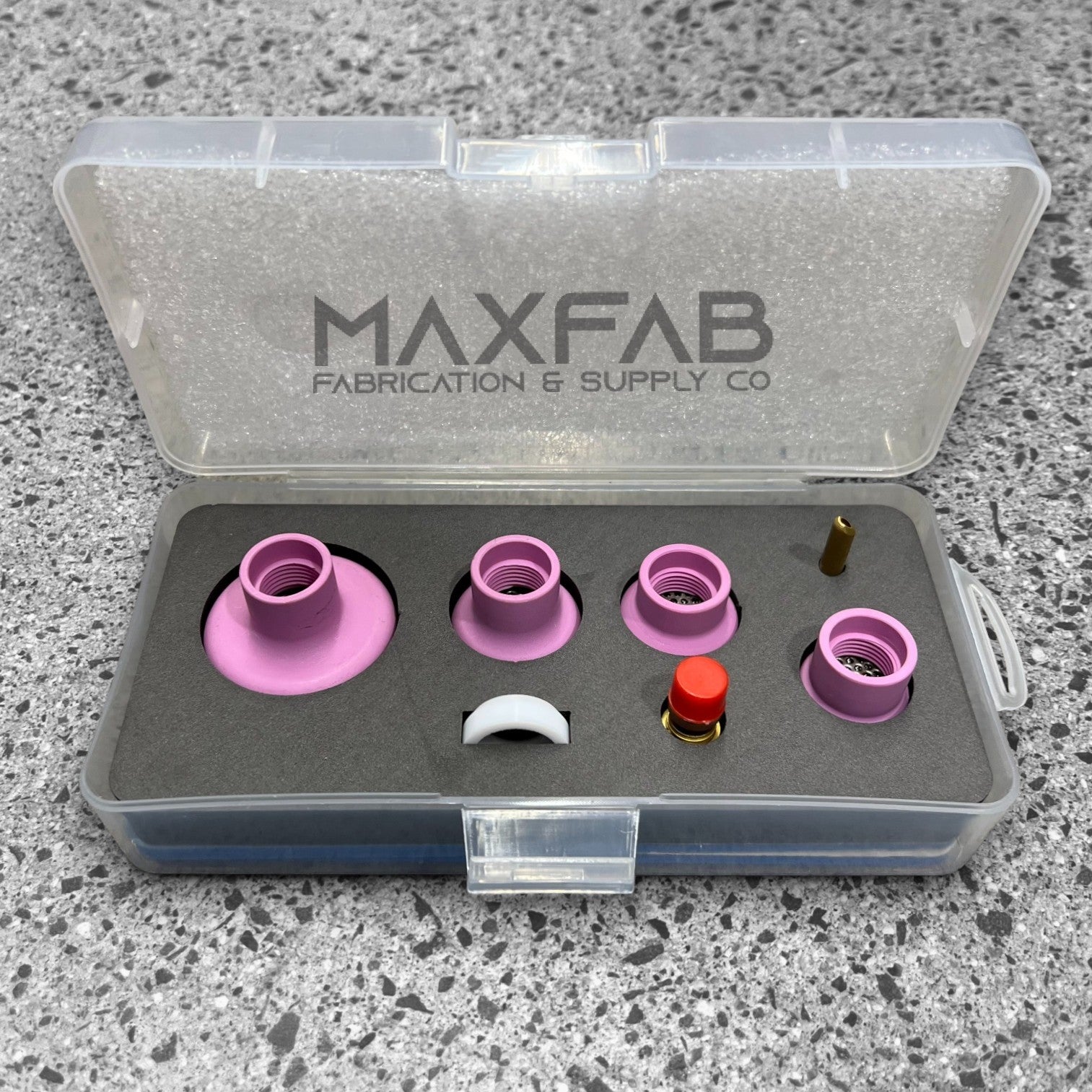 The pink kit includes a PTFE sealing insulator, a stubby gas lense adaptor, (#17 #18 and #26 TIG torch compatible) a stubby 2.4mm collet and four pink ceramic cups (#12 #14 #16 #24) with stainless steel mesh diffuser inserts that offer increased gas coverage and precise welds at low flow rates and up to 4" of tungsten out