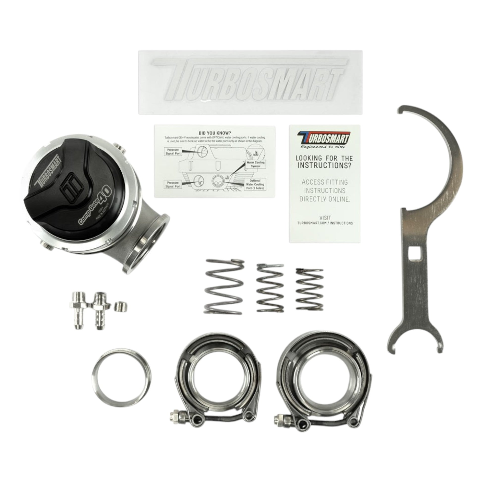Our new CompGate40 wastegates are a direct fit upgrade to all 4th-generation Turbosmart wastegates and feature our unique collar-locking system, variable actuator cap and base, strap-type V-band clamps, liquid-cooling, 1/8 NPT ports, and are provided with the full range of springs.
